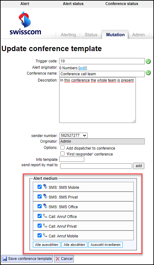 - Selecting the alarm medium in conference templates : The various alarm mediums (voice only) can now be selected/deselected individually in the conference templates (as is also possible in alarm templates). In the triggered conference, only the mediums that are defined as conference mediums are output.